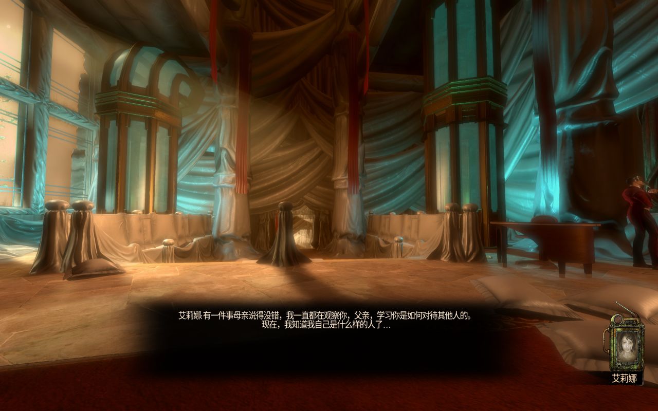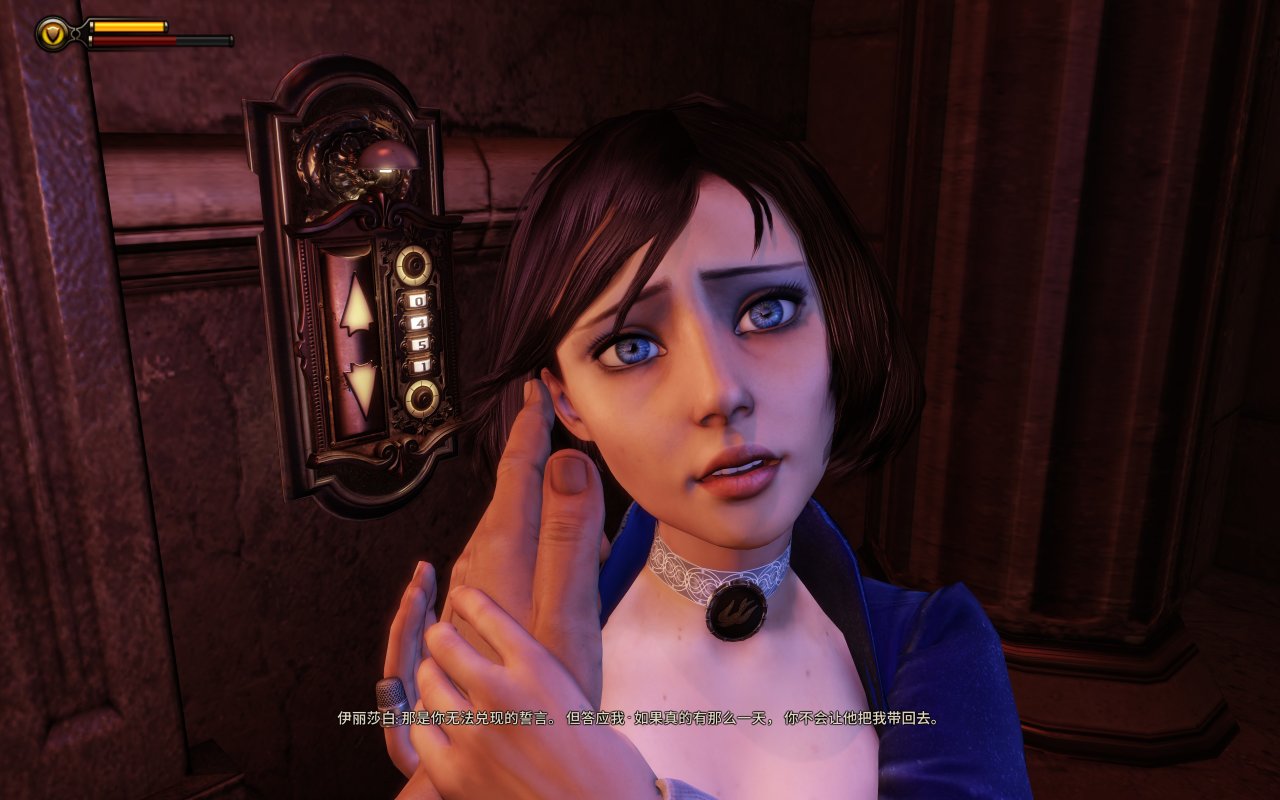 艾莉娜对这个世界的了解非常少,一切的知识都来自于她母亲的洗脑,因此她会把给自己展露世界一角的大老爹当成榜样,信任并学习。而伊丽莎白则从小就被困在图书馆中,却也因此培养了一套属于自己的价值观,所以她和布克之间注定会有分歧或冲突。