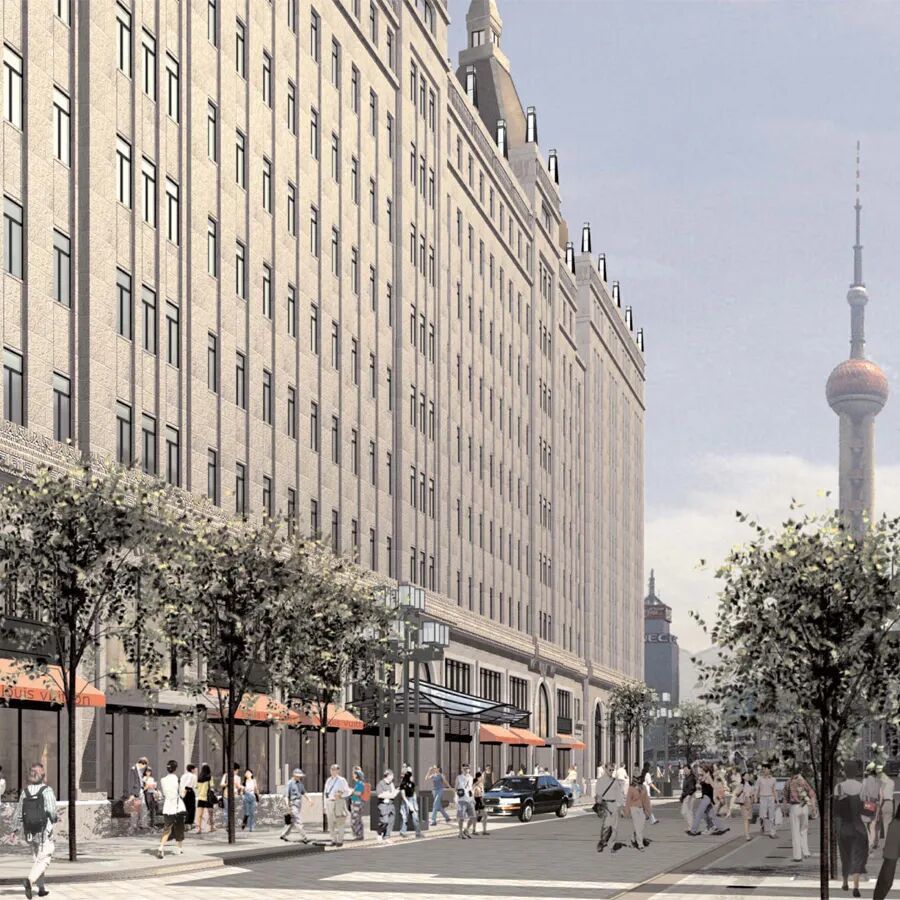 而怡和當時,還聘請了貝聿銘及其事務所,爲和平飯店度身定製了一套修護改造方案,不僅底部加上弧頂玻璃雨篷、頂部加蓋玻璃溫室,整個屋頂線還將由貝氏招牌的多邊形燈柱點亮。