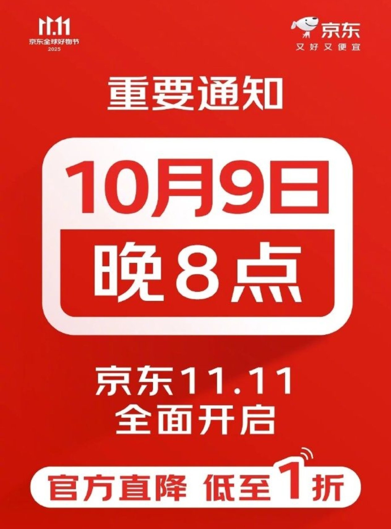 京東於9月29日宣佈,2025年京東11.11購物節將於10月9日晚8點正式啓動。今年京東雙11在時間節奏和促銷玩法上均有重要調整,旨在爲消費者提供更從容、實惠的購物體驗。活動選擇在“十一黃金週”結束後的第一天開啓,爲消費者提供了更充裕的選購時間,並堅持現貨開賣,無需等待預售。