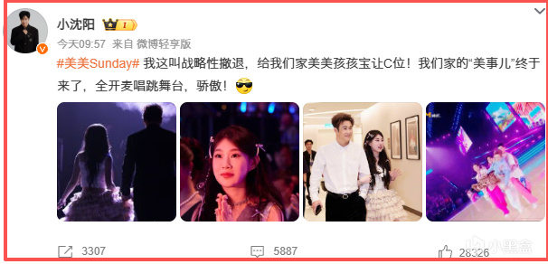 9 月 29 日(今天),小瀋陽也在社交平臺上回應了被 “抬走” 這件事,他表示自己這是 “戰略性撤退”,就是爲了給自家 “美美孩孩寶” 沈佳潤讓 C 位,還提到女兒這次帶來了全開麥唱跳舞臺,言語裏滿是驕傲。