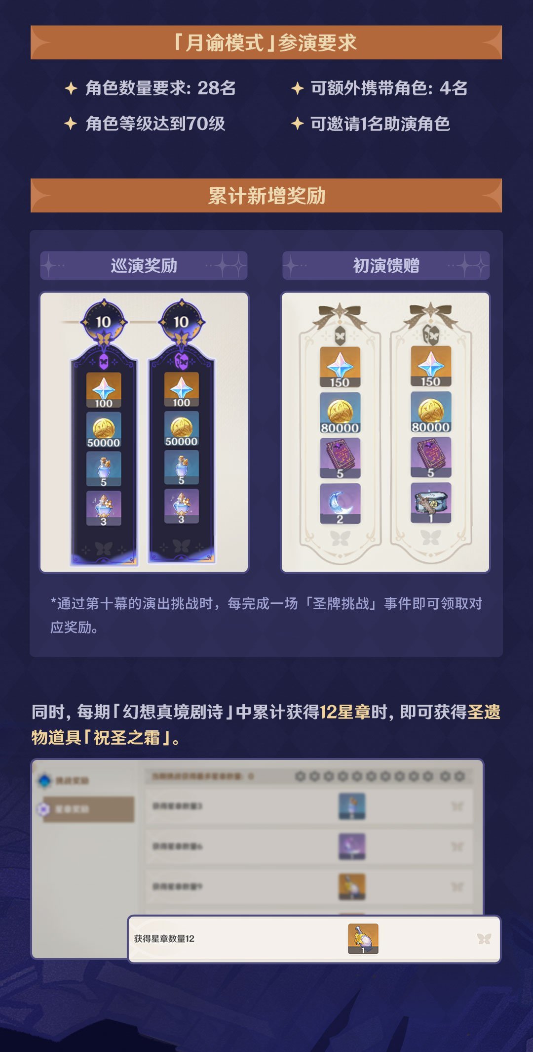 通關並完成演出過程中出現的2個額外挑戰,即可在第十幕的演出挑戰後抽取特別道具「月諭聖牌」,此外,完成挑戰還能獲得原石、聖遺物道具「祝聖之霜」等豐厚獎勵。同時,本次更新還帶來了一系列調整