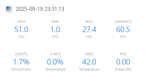 进游戏就已经非常卡了,于是在画面设置我都只设置成了中,最后测到平均帧率仅有27.4帧,即便是最高帧也只有51帧。最恐怖的是这时候手机的温度来到了42°,特别是摄像头区域,已经是烫手的级别了。