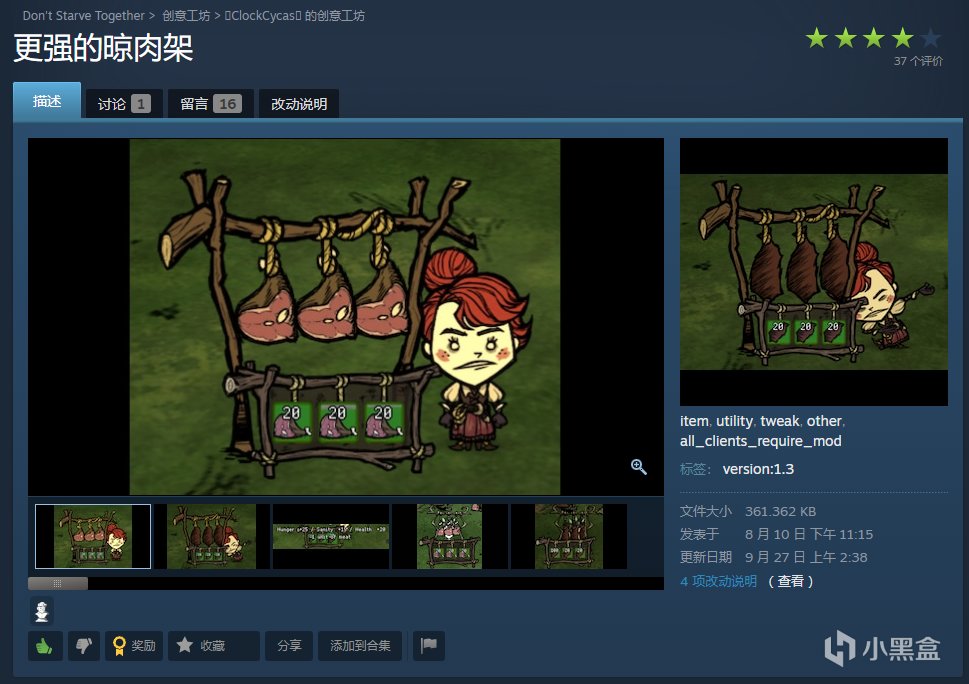 春天下雨晾了兩架子肉,以爲只是晾乾進程慢點,然後全爛了。。。後來發現了這個mod,可以一次性晾很多,甚至一個架子都夠用,下雨也能晾(不過我沒開這個功能),最喜歡的是“晾曬產物不腐爛”功能,只要掛在架子上,什麼時候收都可以。