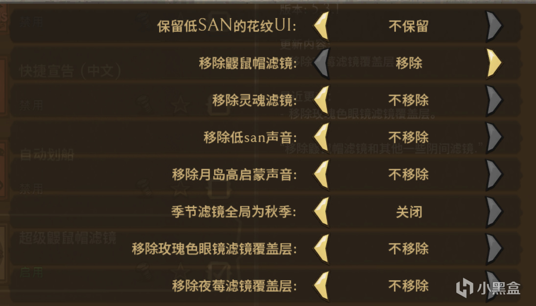 移除低san濾鏡、鼴鼠帽濾鏡、玫瑰色眼鏡濾鏡等等,且都是可選擇的。(用過濾鏡RR,但是它會把冬季積雪也清除了,我還是比較想保有四季特色。)
