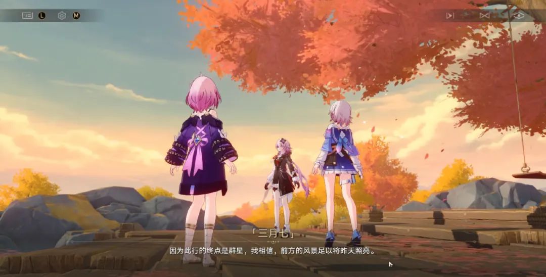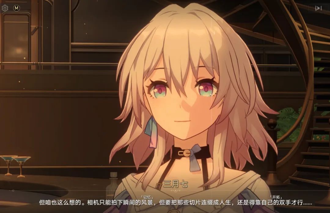 而身份、名字、記憶等過去的一切都遺失的三月七,在這一場場驚險的開拓之旅中,也收穫了僅屬於當下自己的回憶。我很喜歡2.4版本的活動「初花習劍錄」,三月七習武學劍的故事就挺有意思,氛圍詼諧歡樂,卻也見證着她的努力與成長。