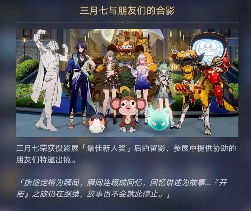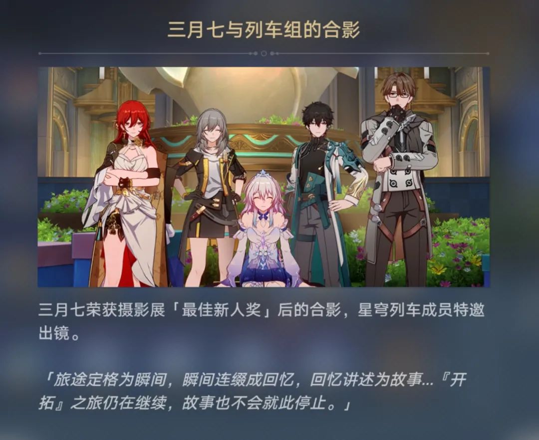 每張合影都承載着一段記憶,記錄着三月七與開拓者、列車組和冒險中結識的夥伴們的故事和羈絆,它們都是小三月的珍貴回憶,而當這些記憶的切片被連綴起來的時候,便構成了屬於三月七的「開拓」人生。