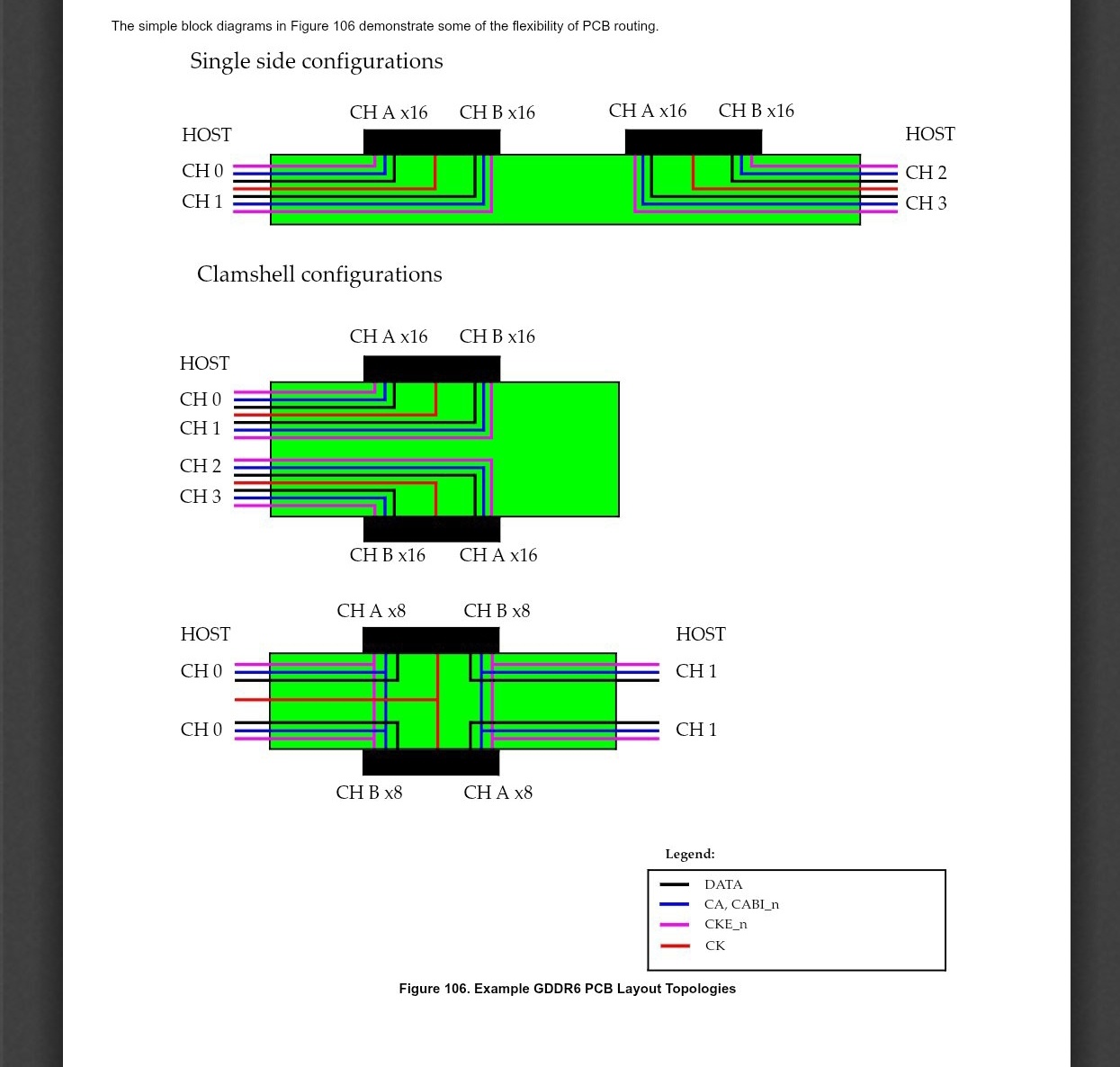 補充:爲什麼雙面顯存是x8工作模式,單面是x16模式,首先一個顯存顆粒是32bit的位寬,GDDR6X可以拆分成兩個獨立的子通道分別同時進行讀寫操作,32分兩半就是x16了,這就是x16模式,正好是32bit,那麼如果是雙面,很顯然兩個顯存要共享這32bit,每個顯存分16bit,還要保持兩個子通道,所以每個子通道就的x8了,這就是x8模式。具體佈線看圖4。