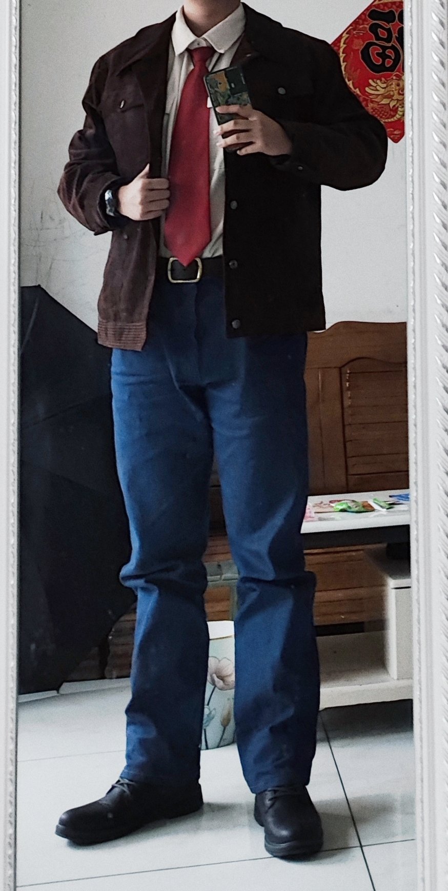 深棕色衬衫夹克内搭浅色系衬衫,系上红色领带,下装搭配深蓝色牛仔裤,搭配黑色皮鞋。