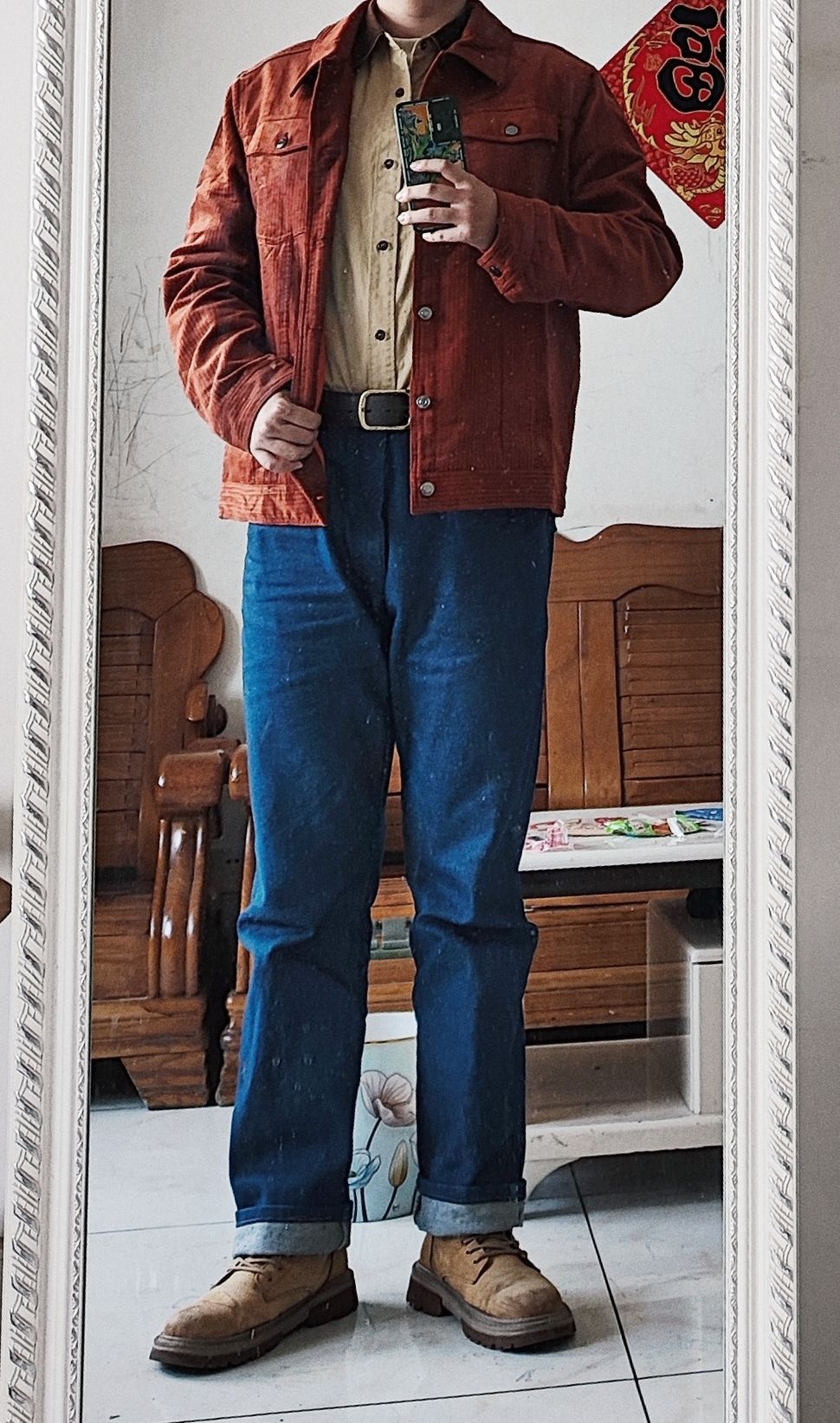 首先是这件砖红色的,比较修身,颜色比较活泼,灯绒芯的,有一定厚度。橘红色衬衫夹克内搭米白色T恤,下装选深蓝色牛仔裤,搭配棕色工装靴。硬朗复古的休闲韵味,整体造型松弛又有格调。
