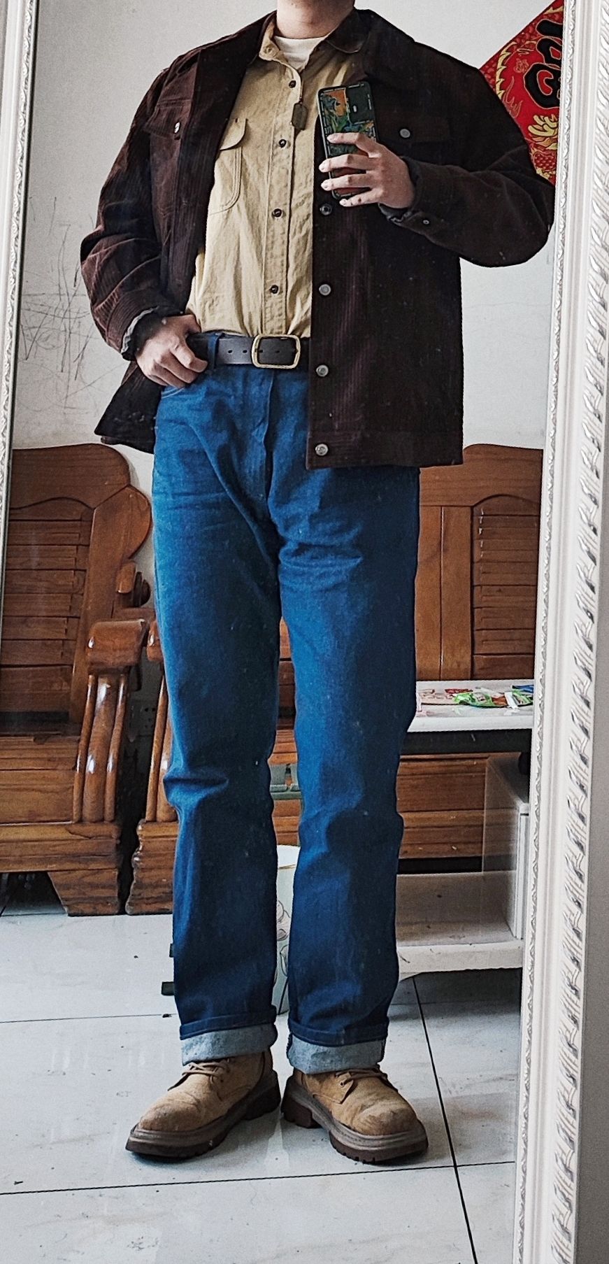 另外一件是深棕色的,码数偏大一码,袖子很长。深棕色衬衫夹克内搭卡其色衬衫,下装搭配深蓝色牛仔裤,搭配棕色工装靴,用棕色皮带点缀。