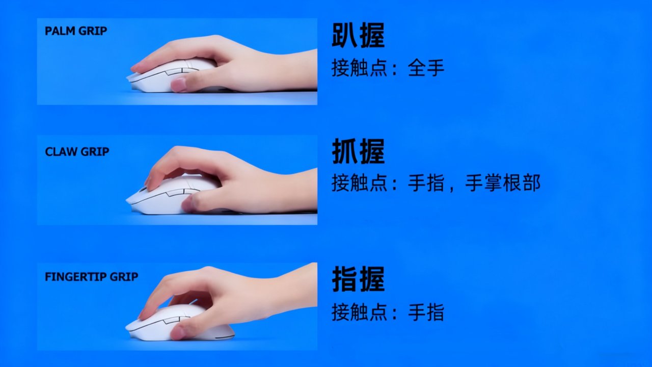 指握就是仅手指接触,手掌悬空,适合小巧紧凑的鼠标,追求极致轻量化与操控灵活性