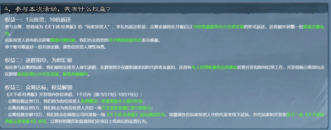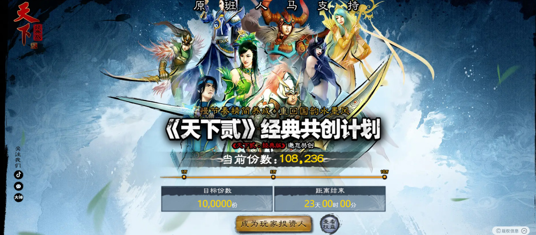 而这样的氛围,也反映在共创计划的众筹环节上。在第一期玩家投资人汇报结束后的两个小时内,游戏的众筹份额就从7万增至10万,顺利达成了原定目标。而在整个计划进行的过程中,甚至有玩家自发买上几千份支持计划,让团队自己都颇感意外,足见玩家们对这一计划的投入与关注,以及他们对《天下贰》满溢的感怀与热情。