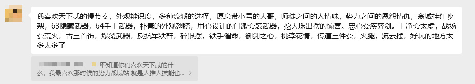 而在《经典版》玩家群里,许多老玩家更是激动不已。在经典版的设计框架公布后,一时之间许多玩家感叹着“回来了,都回来了”,或诉说着他们当年在《天下贰》里经历的青春,或诉说着他们对《经典版》的期愿,整个群聊顿时成了老玩家们的大型狂欢场。