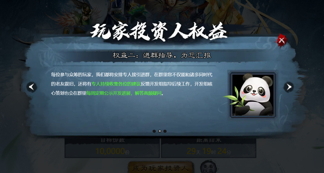 在制作组的计划中,玩家只需交上一元钱,就可以成为“玩家投资人”。加入该计划后,玩家不仅能在游戏上线后获得 10 倍礼包返还权益,还可以通过群聊参与开发讨论、提供建议,而游戏的开发进展也将会实时更新在群聊里。制作组表示,随着众筹份数越多,玩家也能享受到更多权益,甚至参加游戏的内测试玩活动。