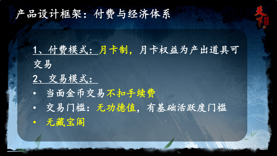 而没过多久,在9月25日,《天下贰经典版》便开启了直播,进行了第一期“玩家投资人汇报”,详细介绍了游戏的各项设计框架。比如在付费模式上,《天下贰经典版》将采用月卡制,而交易系统也没有功德值设计,只设定基础的活跃度门槛。