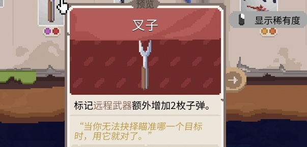 很强力的道具,虽然看似和提升弹道的叉子差不多,但依赖射速射程,只能够给到强力