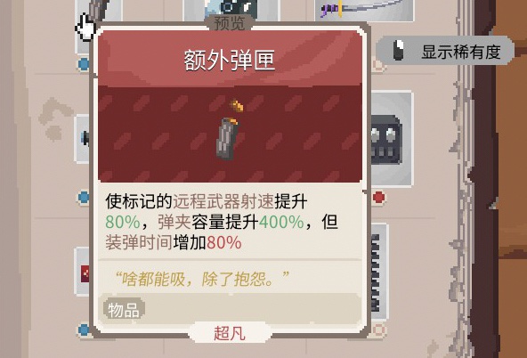 这个就没什么必要讲解了,扩容武器只有他独一份,但是需要注意的是如果你用警长,他和警长被动比较冲突,只需要叠加其他加成道具即可,RPG这种武器配合警长轻易不要使用扩容,后期使用扩容的话伤害会提高,这一点看大家喜爱了,装弹夹=提升单次伤害,不装弹夹=提高触发次数