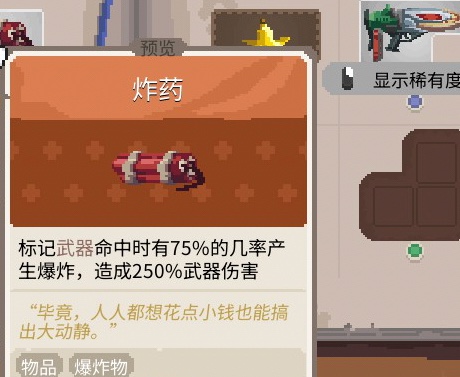 最高65%概率触发,造成200%伤害,远近武器通吃。可合成道具炸药,为烟花提升版本,满级为75/250