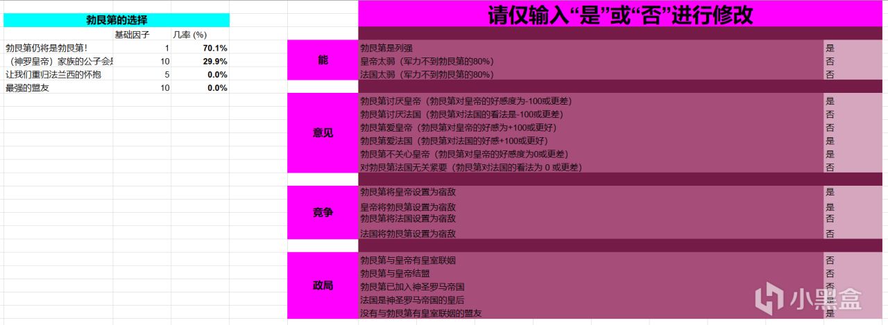 最后,我得使用裂颅计算器算一算了(以法兰西视角,当皇帝、联姻、结盟拉好感),怎么概率为0啊?喔~只有皇帝30%的概率。