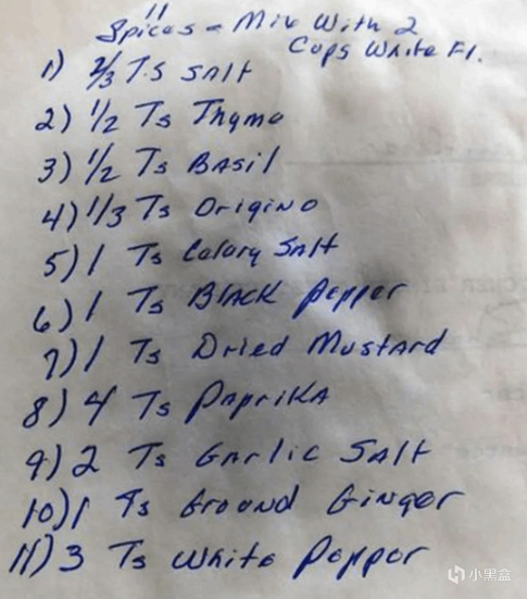 他公佈的配方里有 11 種香料,都是西餐裏常見的,像鼠尾草、丁香、肉豆蔻、肉桂,還有紅辣椒、芫荽籽、姜、大蒜粉,以及白胡椒、黑胡椒和豆蔻,這些材料做成粉末也很方便。