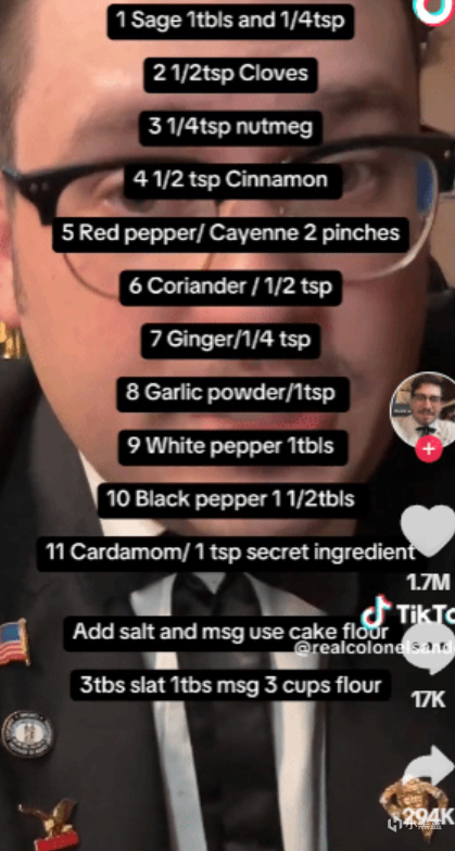 這人在 TikTok 上平時就愛打扮成肯德基爺爺的樣子,還總自稱 “上校”,他說自己是創始人的曾侄孫。這次之所以要把配方說出來,是因爲他覺得自己被肯德基官方賬號屏蔽了,想以此報復。