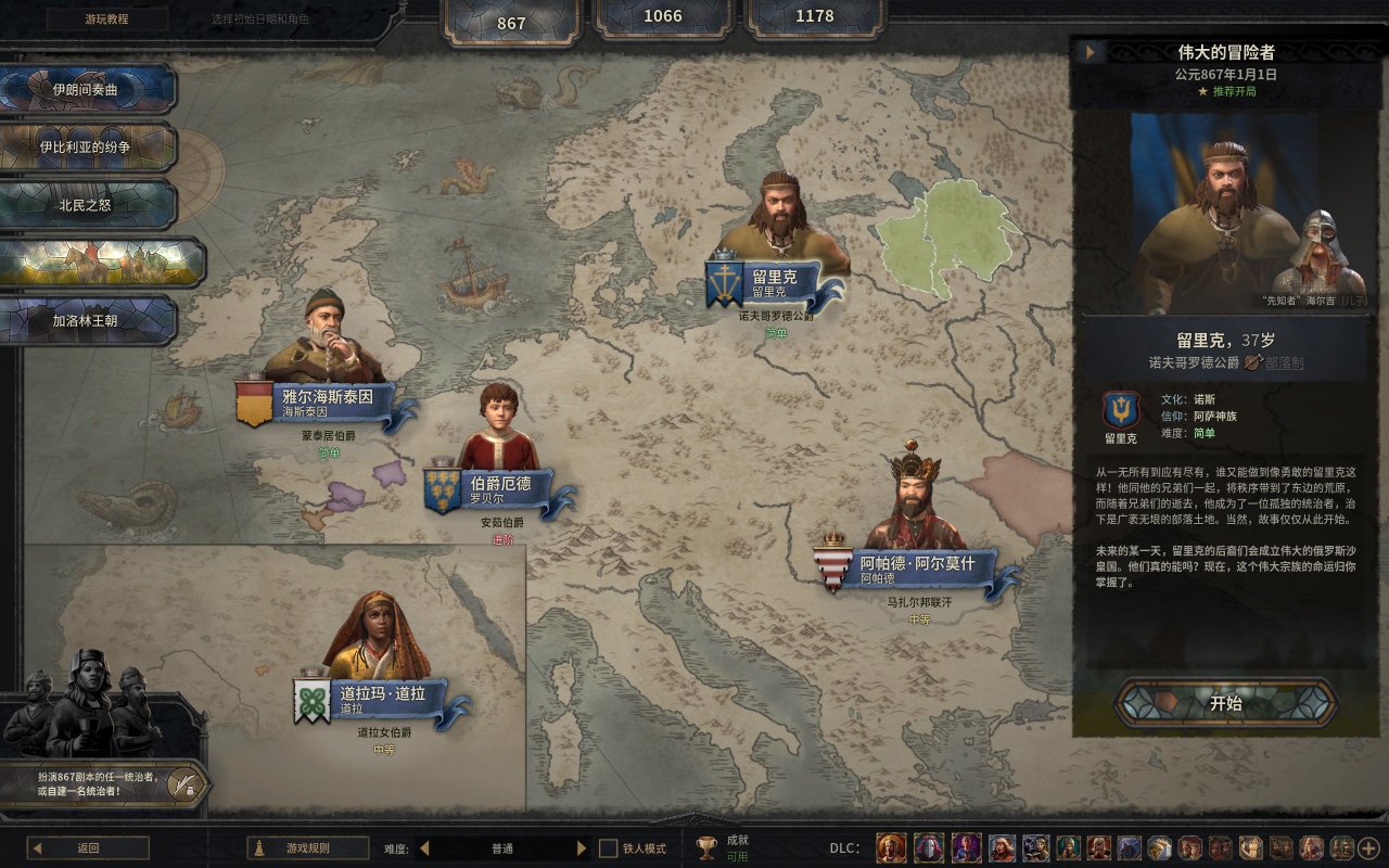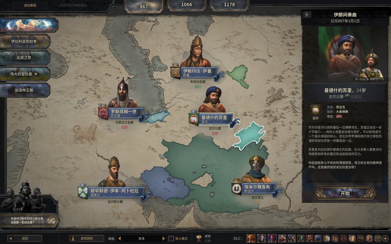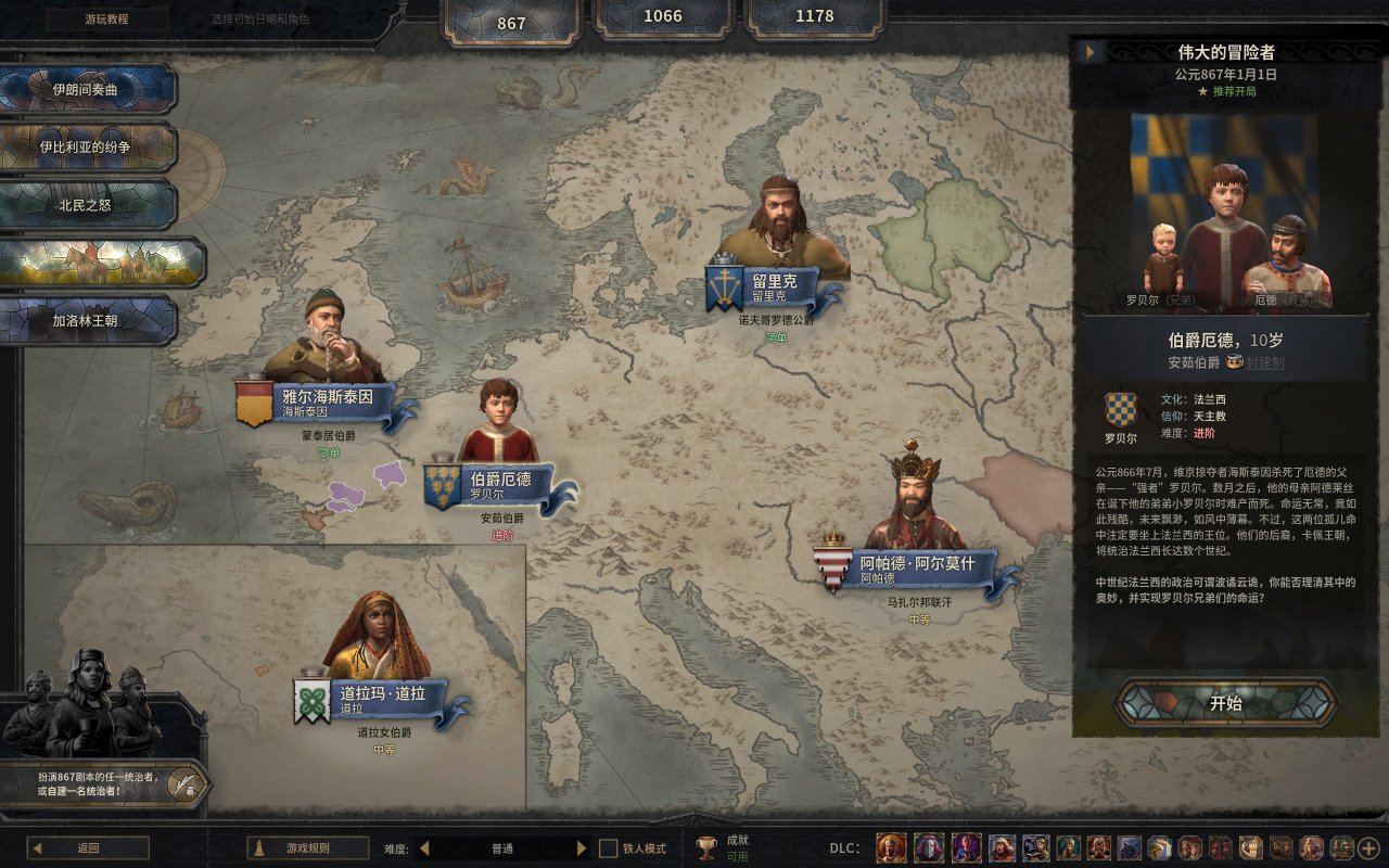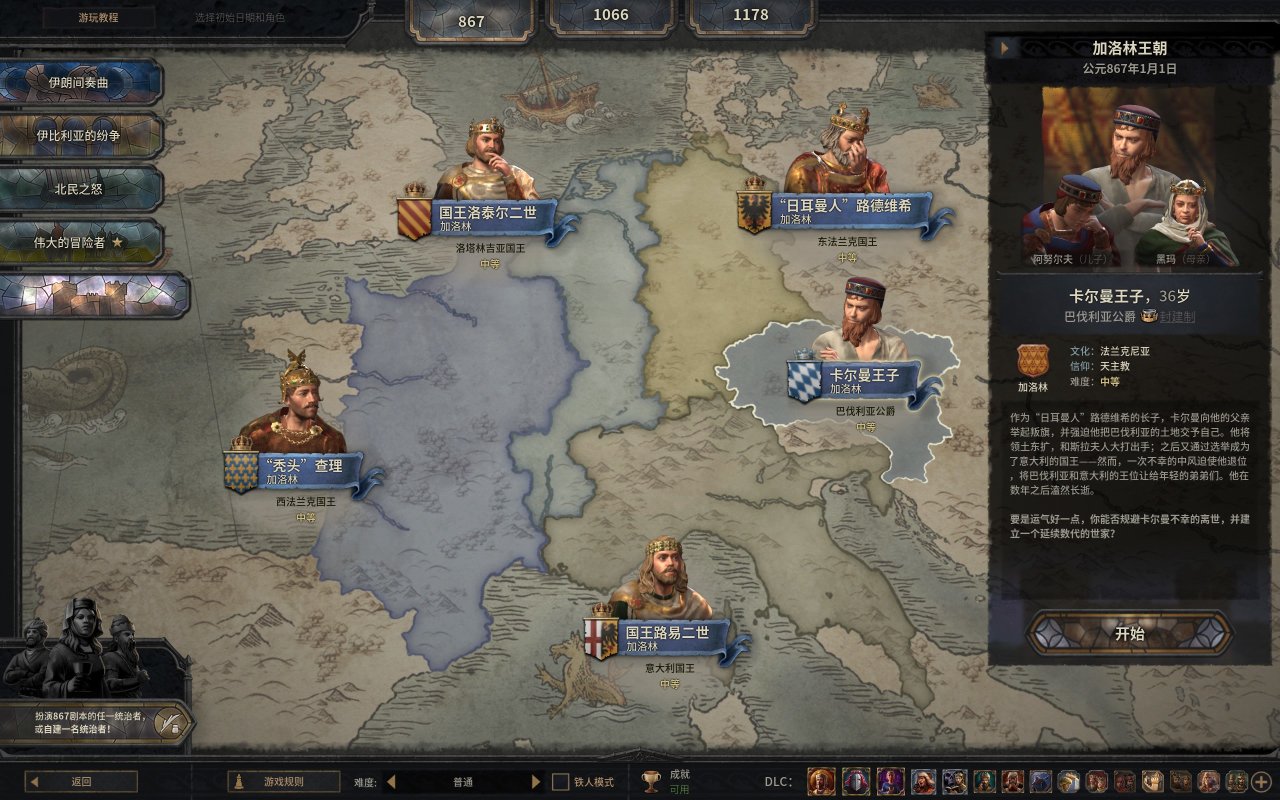 攻略;由于开局处于过扩状态,导致卡尔曼开局会比较坐牢,但是相对来说你的邻居并不强大(有征服者另算),可以通过东扩从而提神实力,最后统一加洛林。