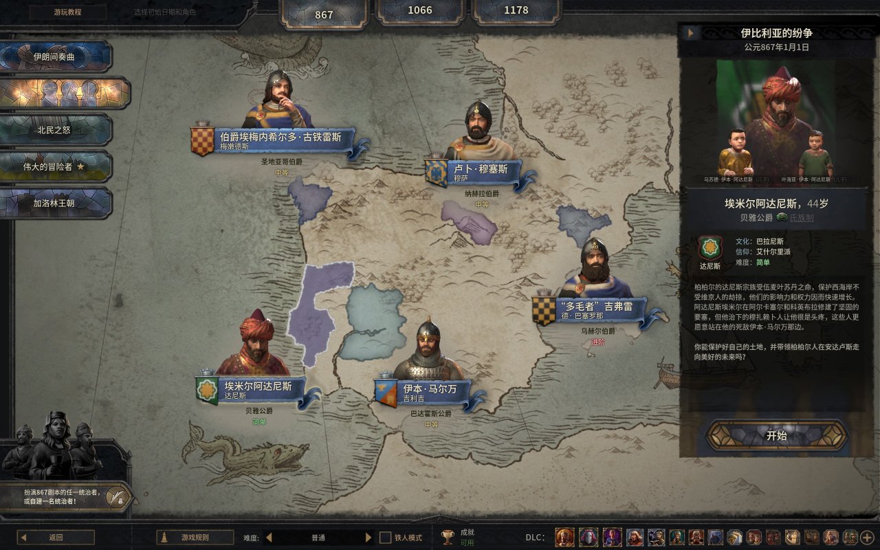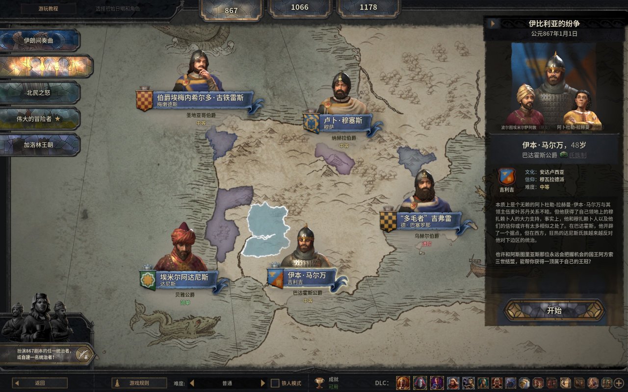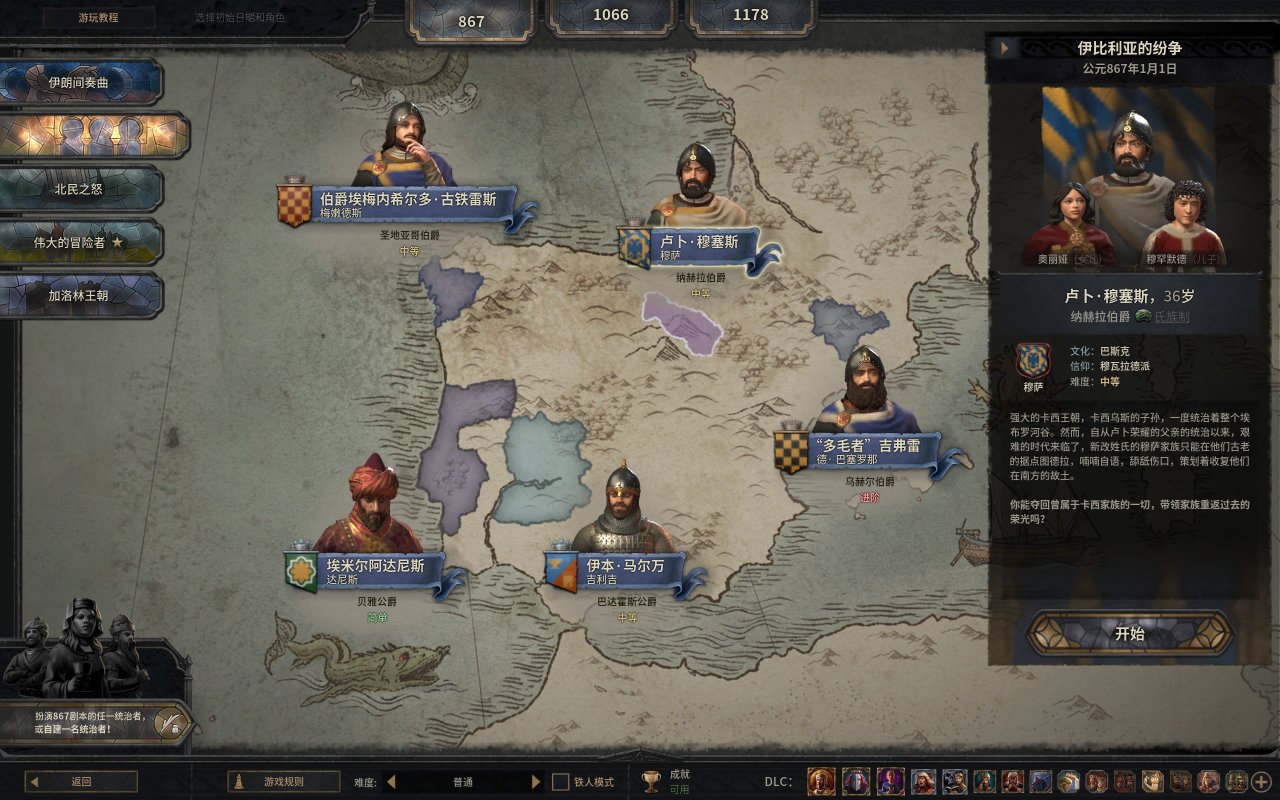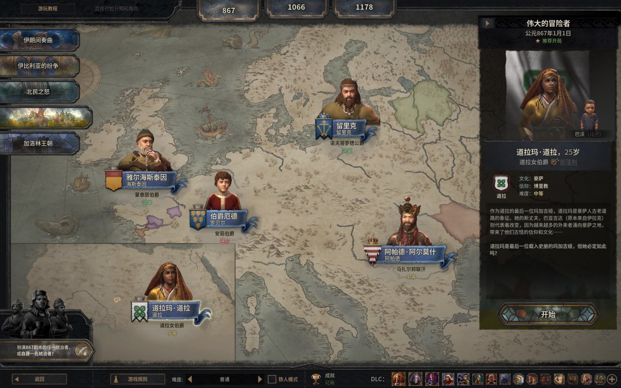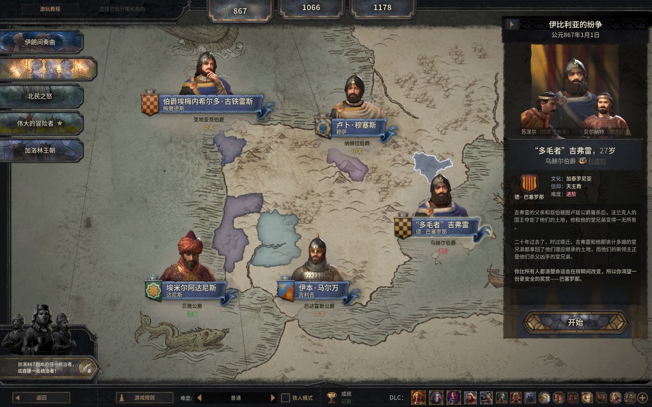 攻略;由于开局处于过扩状态,导致卡尔曼开局会比较坐牢,但是相对来说你的邻居并不强大(有征服者另算),可以通过东扩从而提神实力,最后统一加洛林。