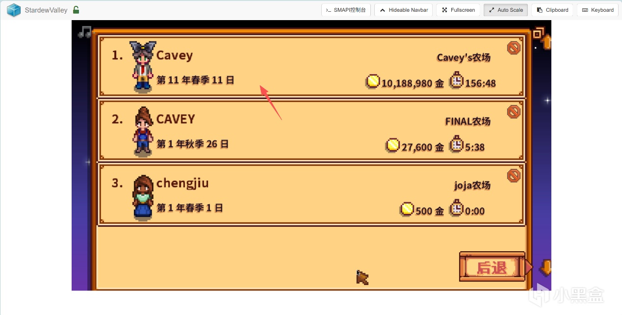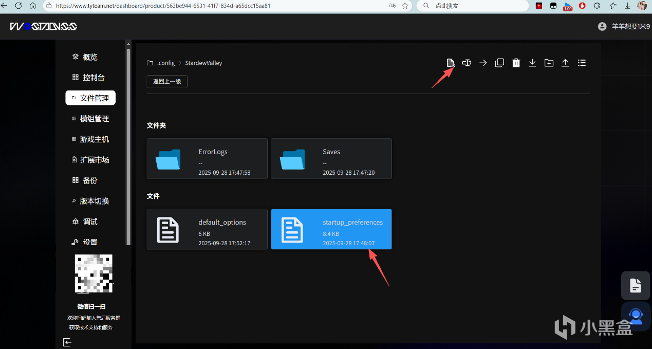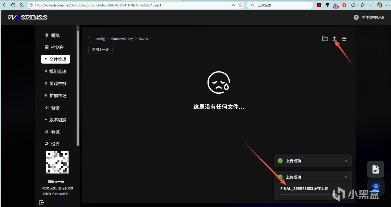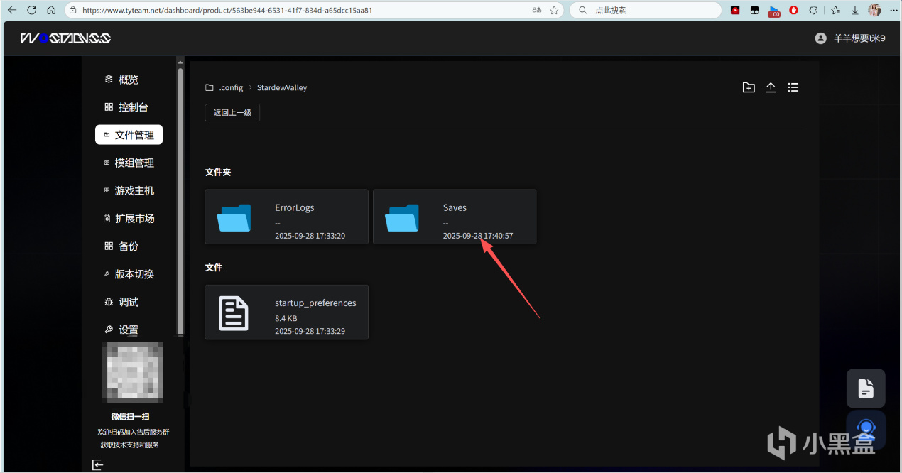 如果想用存檔接着玩。先點服務器裏的文件管理,按順序點“.config→StardewValley→saves”,將自己的存檔上傳,這樣就能無縫銜接之前的進度。