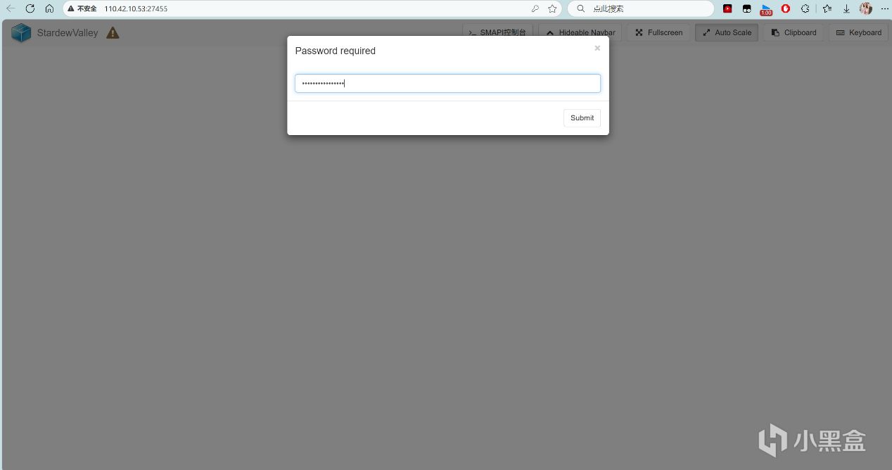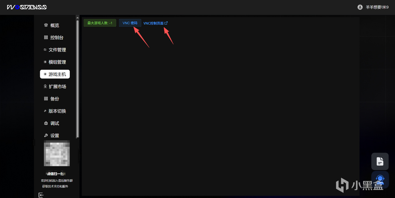 先點擊服務器的遊戲主機選項,複製右側的VNC密碼,再點旁邊的VNC控制頁面,按Ctlr+V輸入密碼提交,就能打開服務器。