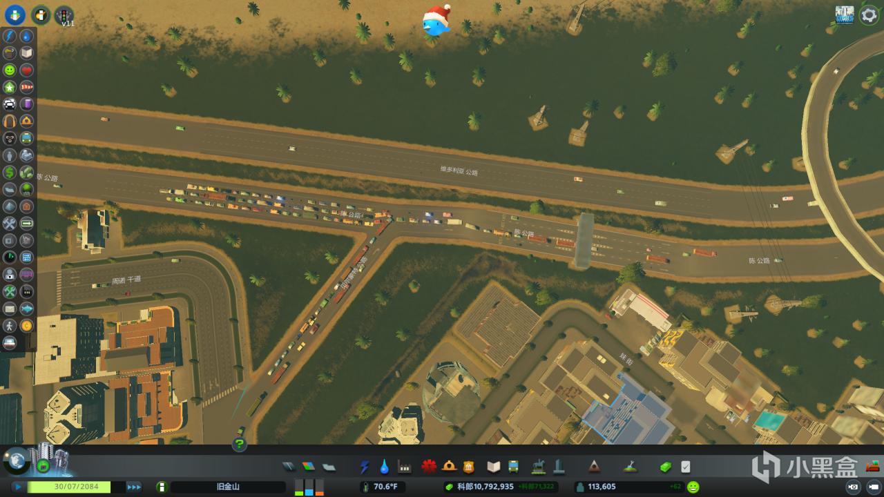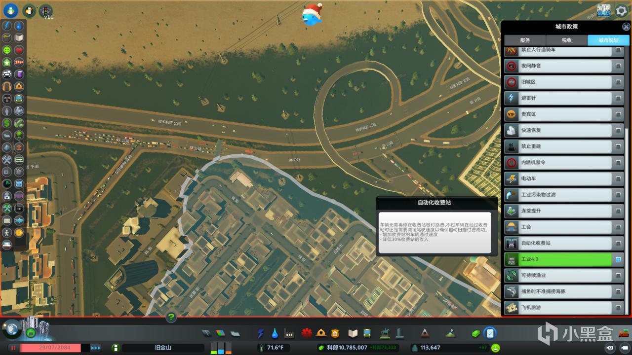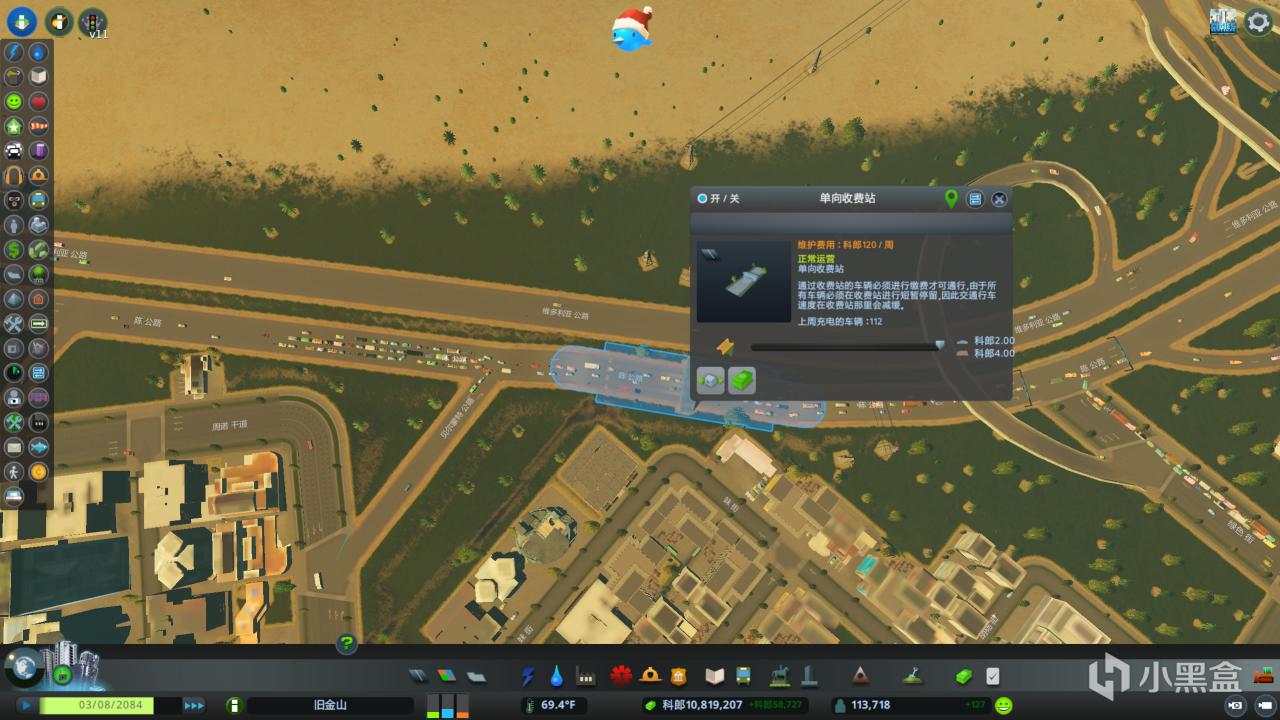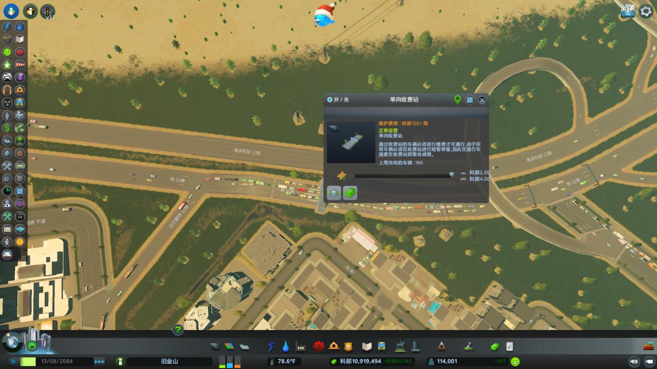 我首先選取了高速路上車流較多的地方,建造了一個收費站(一般建在必經之路上,比如上下班途中等等,否則居民會更偏向跑到沒有收費站的路上)