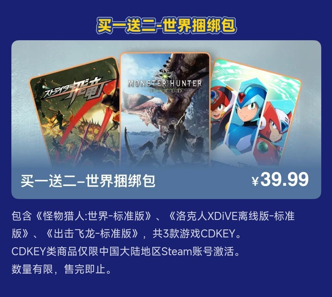 這個組合包我給的理由與上一個同理,怪獵世界也是隻有本體沒有DLC,出擊飛龍也是之前9.9組合包的東西,但是這個組合包裏有一個之前沒出現的洛克人X DIVE,但是我本人對洛克人不是很感興趣,而且這個遊戲可能也會出現在之後的19.9組合包裏,所以這個組合包我個人依舊是不太推薦購買的,當然這個組合包比崛起那個性價比高一些,主要還是看你們個人了。