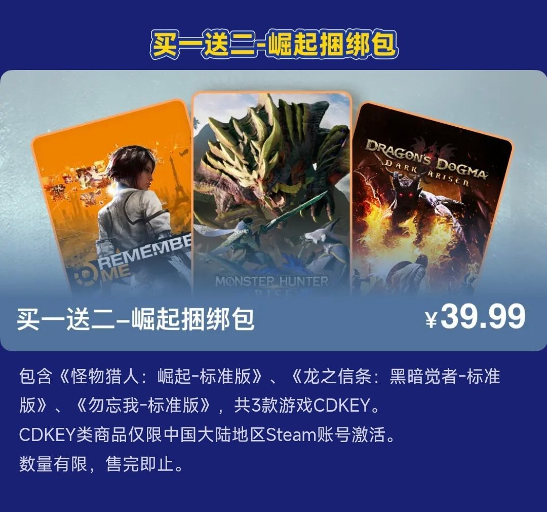 我個人是不太推薦這個組合包的,因爲龍之信條和勿忘我之前都是卡普空9.9組合包裏的東西,而且如果你真的想玩怪獵崛起,推薦是帶曙光DLC一起買,這個組合包只有一個本體,你去補曙光DLC的話價格會貴不少。
