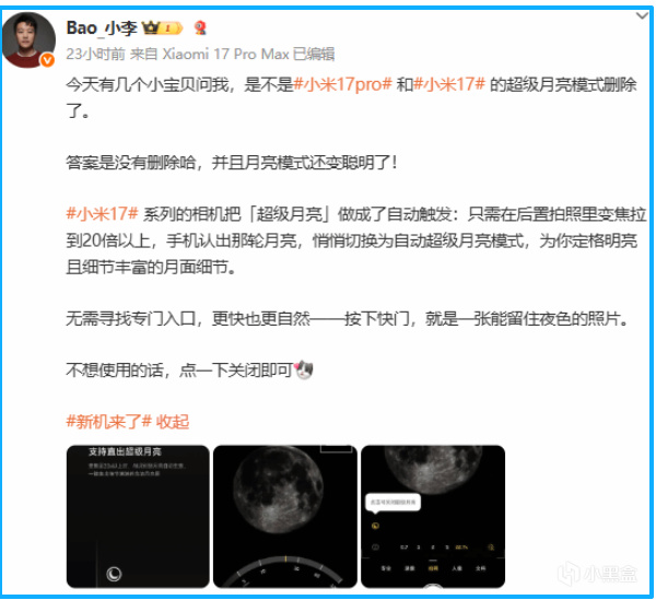 随着机型热销,有用户疑问小米 17 Pro 和小米 17 的超级月亮模式是否被删除。9 月 28 日下午,小米相机部产品经理 @Bao_小李 专门对此作出回应,明确表示该模式没有删除,而且还变得更聪明了。