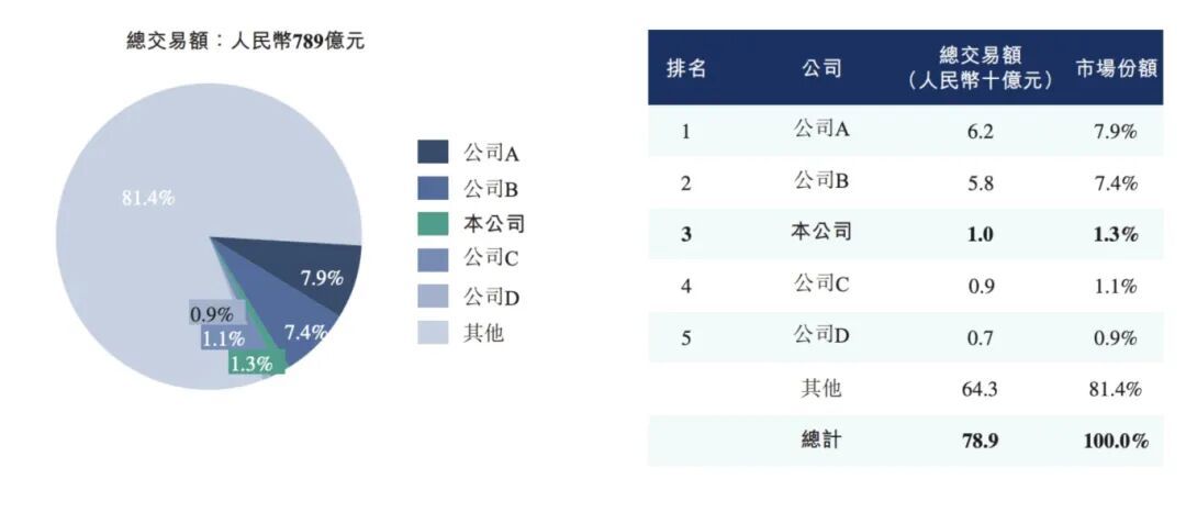 根據弗若斯特沙利文報告,按 2024 年手機裝置的總交易額計,愛回收的交易額爲 62 億元,市場份額爲 7.9%,轉轉的交易額爲 58 億元,市場份額爲 7.4%。