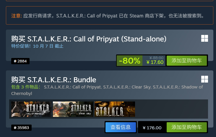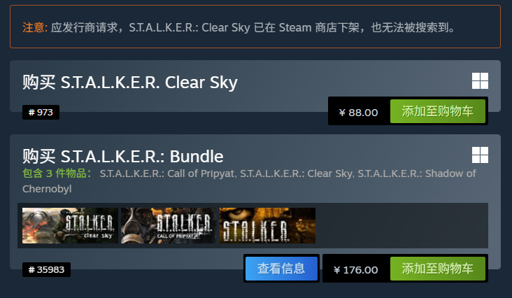 在今日steam的秋促也是正式開始,有很多遊戲都開啓了折扣,其中就包括了《潛行者》系列作品,舊作在steam商店顯示,該產品已被下架也無法被搜索到,但是現如今可以在steam上面搜索到並且購買添加入庫。