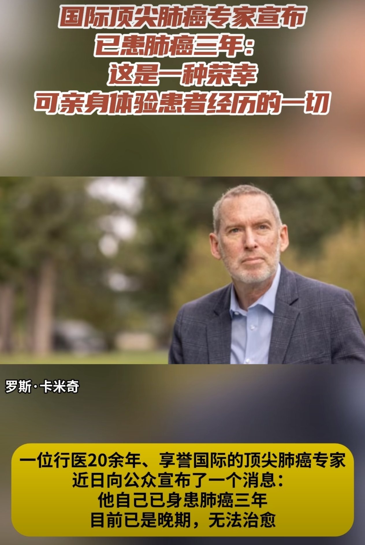 羅斯·卡米奇醫生,美國科羅拉多大學癌症中心肺癌項目主任,近日向公衆宣佈了一個令人震驚的消息:他本人已身患晚期肺癌三年。這位行醫20餘年、享譽國際的頂尖專家,幫助過成千上萬患者延長生命,如今卻成爲自己畢生研究的疾病“活病例”。
