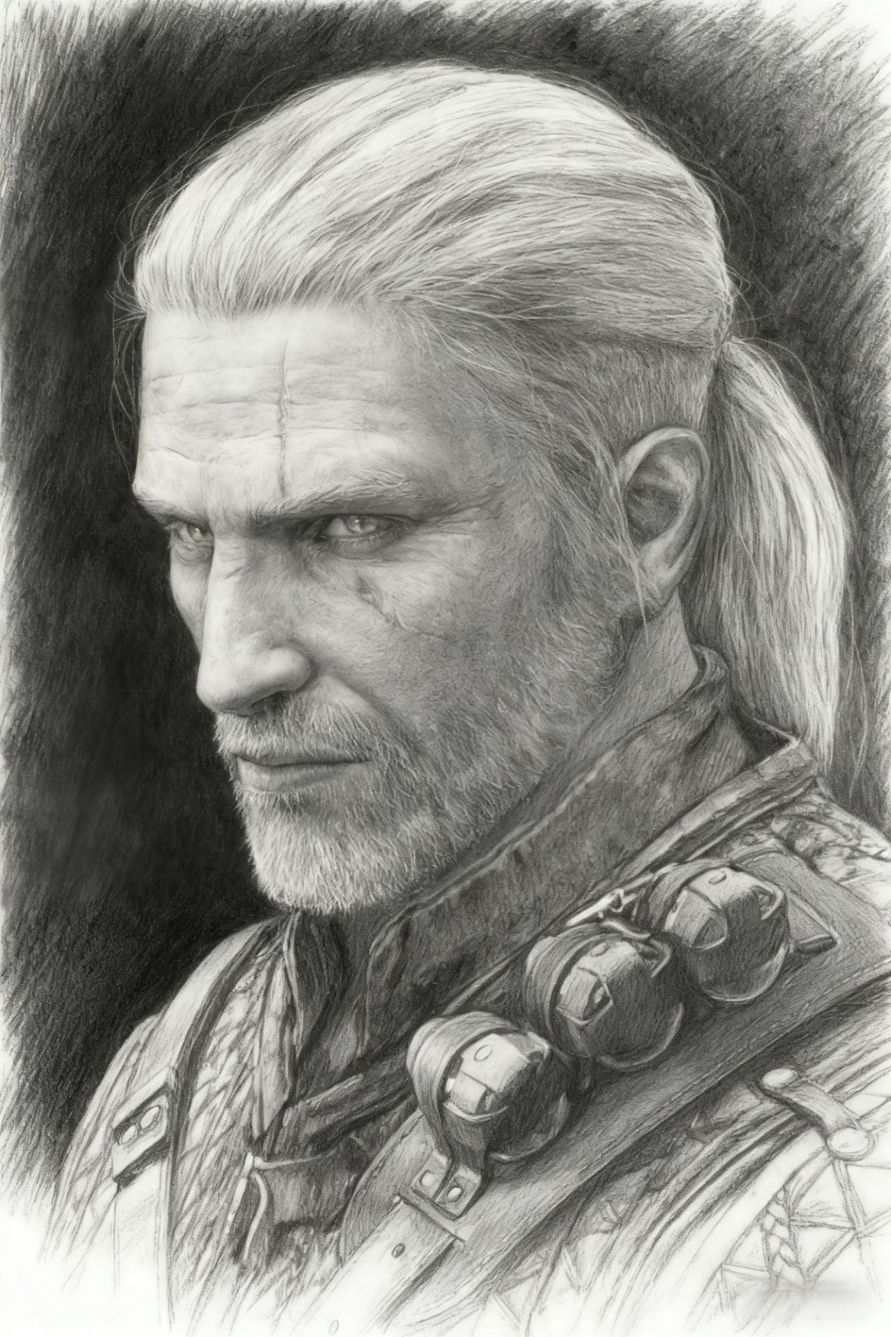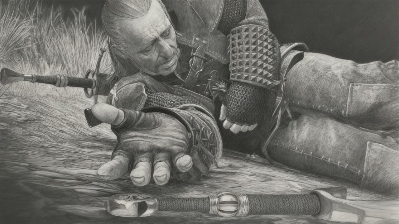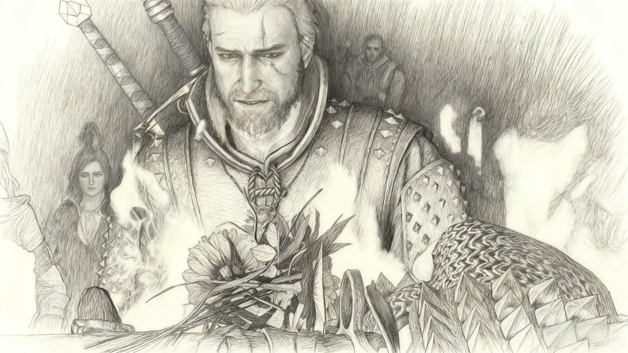 他不舍啊,他无奈啊,他悲伤啊,他气愤啊,他也会痛苦,他也会难过,猎魔人毕竟也是人啊,我为他跟我讲的故事,画了素描,加了几笔无奈加了几笔悲哀。