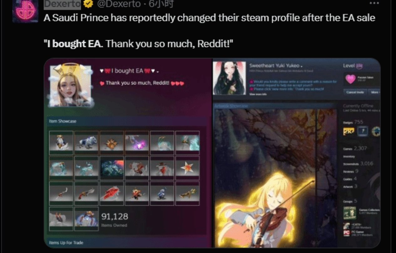 在EA收购消息公布后,一位沙特王子将自己的Steam昵称改为了“I bought EA”(我买下了EA)。这位王子正是热衷于《Dota 2》和皮肤收集,且对动漫情有独钟的沙特王室成员。事实上,沙特王储穆罕默德·本·萨勒曼本人就是一位知名游戏迷,他曾公开表示喜欢《使命召唤》系列。在他的推动下,游戏产业已成为沙特“愿景2030”经济转型计划的重要组成部分。