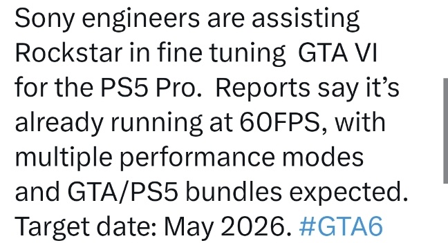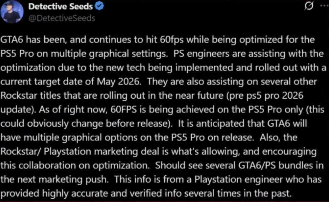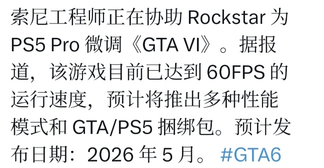 翻譯:GTA6 已經並且持續在 PS5 Pro 上以多種圖形設置實現 60 幀運行,目前正在爲其進行優化。由於遊戲中採用了新技術,PlayStation 的工程師們正在協助進行優化工作,目前的目標發佈日期是 2026 年 5 月。他們也在協助優化其他幾款即將在近期發佈的 Rockstar 遊戲(在 2026 年 PS5 Pro 更新之前)。就目前而言,60 幀僅能在 PS5 Pro 上實現(這在發佈前顯然可能會有變動)。預計 GTA6 在 PS5 Pro 發佈時將提供多種圖形選項。此外,Rockstar 與 PlayStation 的市場合作協議正是促成並鼓勵這種優化合作的原因。在接下來的市場推廣中,我們應該會看到多款 GTA6/PS 同捆套裝。此消息來源於一位 PlayStation 工程師,該消息源過去曾多次提供高度準確且經過驗證的信息。