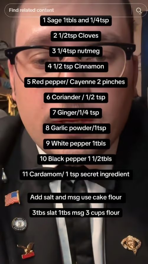 根据这位自称亲属的说法,以下成分构成了肯德基著名的11种香草和香料混合配方: