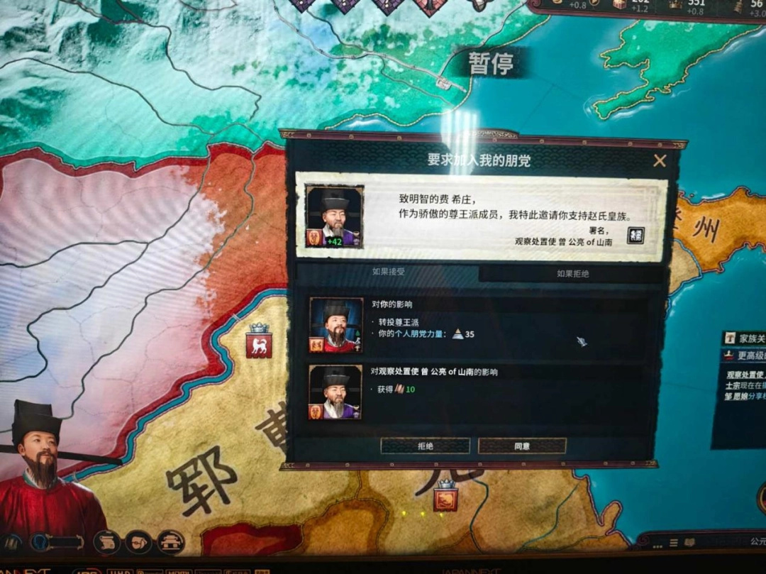 而第二步,就是加入“朋黨”。你可以花費影響力加入“尊王黨”“攘夷黨”“進取黨”“守舊黨”等不同的朋黨——不過,如果你能在官場上積累成績、打出聲望,各個朋黨也會競相爭取你的加入,就算你已經加入某個朋黨,時不時還會有其他朋黨的成員拉你“跳槽”。