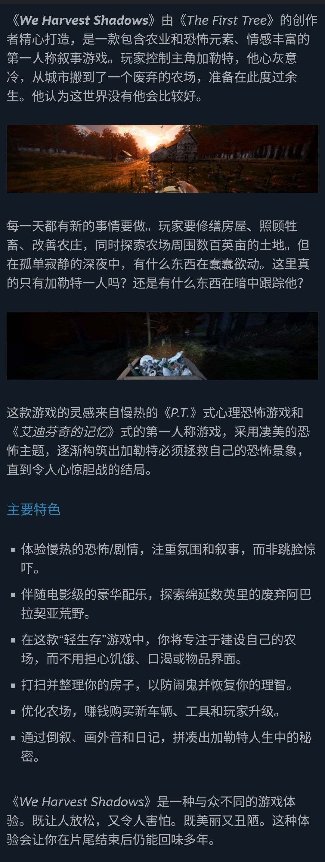 第一人称视角的农场恐怖寓言。成为一名隐士,建立自己的农场,度过孤独的夜晚。