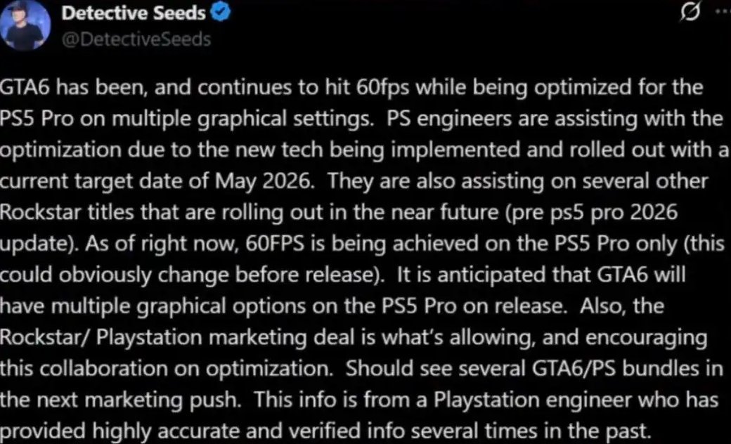 知名爆料人“侦探Seeds”近日透露,《GTA6》目前已在PS5 Pro开发机上实现稳定60帧/秒运行,且索尼工程师团队正与Rockstar展开深度技术合作,为这款备受期待的游戏进行专项优化。