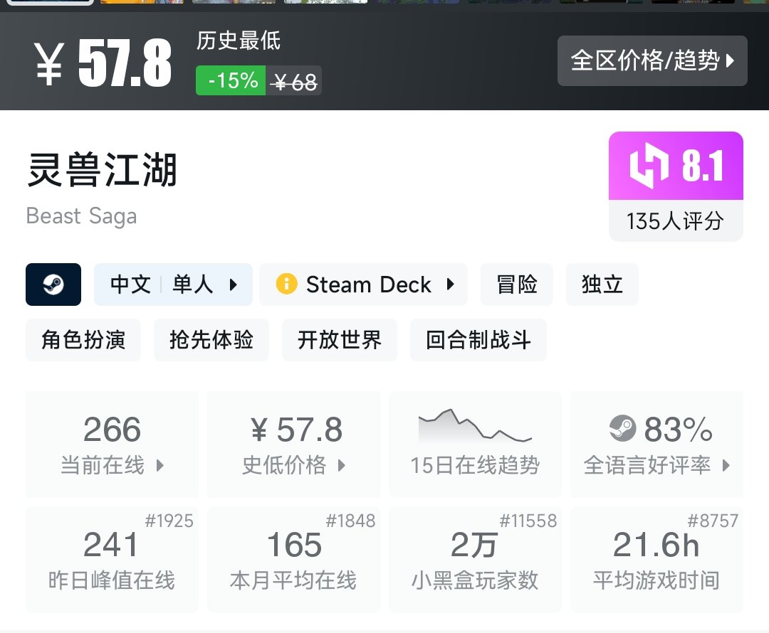 一款开放世界灵兽武侠RPG游戏。秋促史低八五折57.8元,九月时已开启创意工坊,进行了第四章及相关内容的更新。后续还会有更多相关内容的修复更新,值得期待。