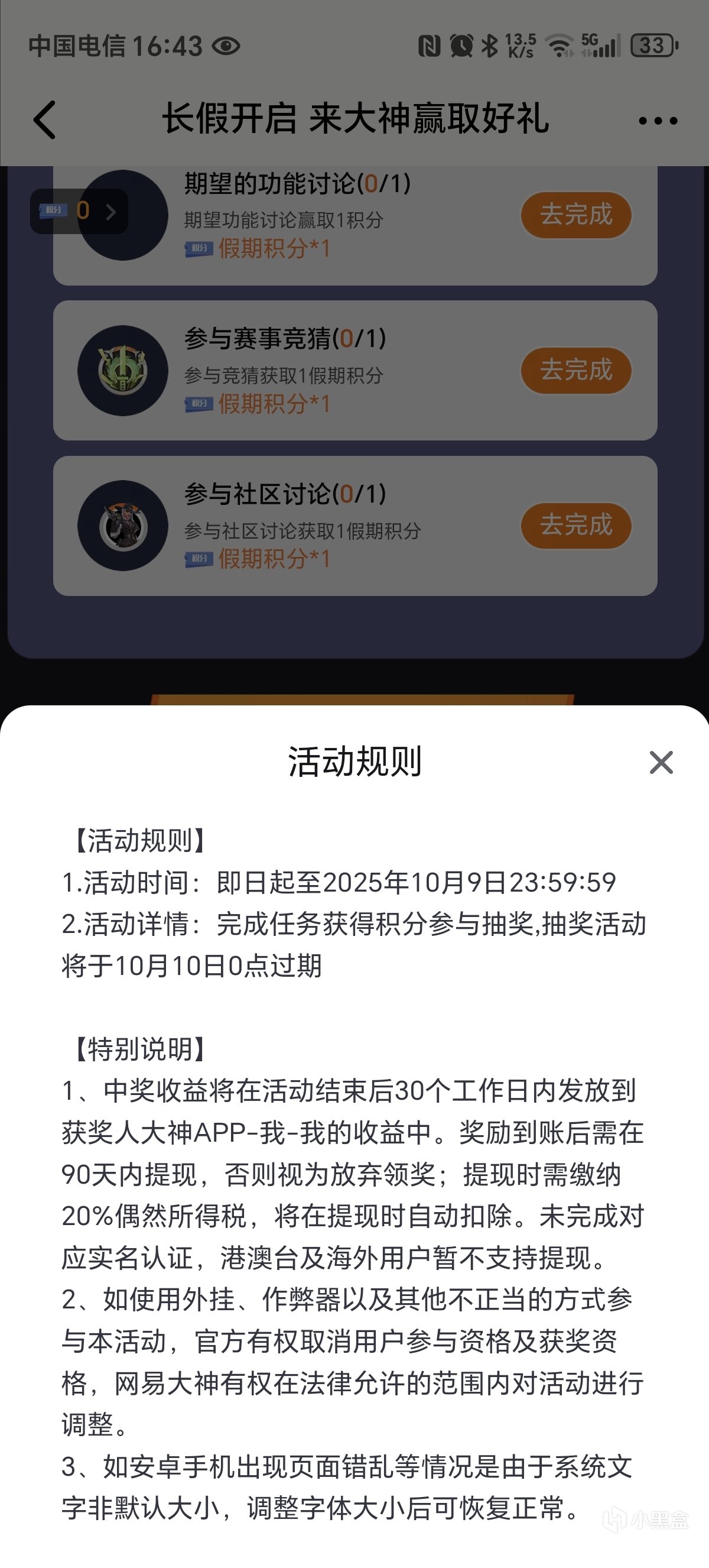 活動截止時間爲10月10號0點,網易大神app每日任務得積分抽獎,應該是中不了,懶的登上去抽。
