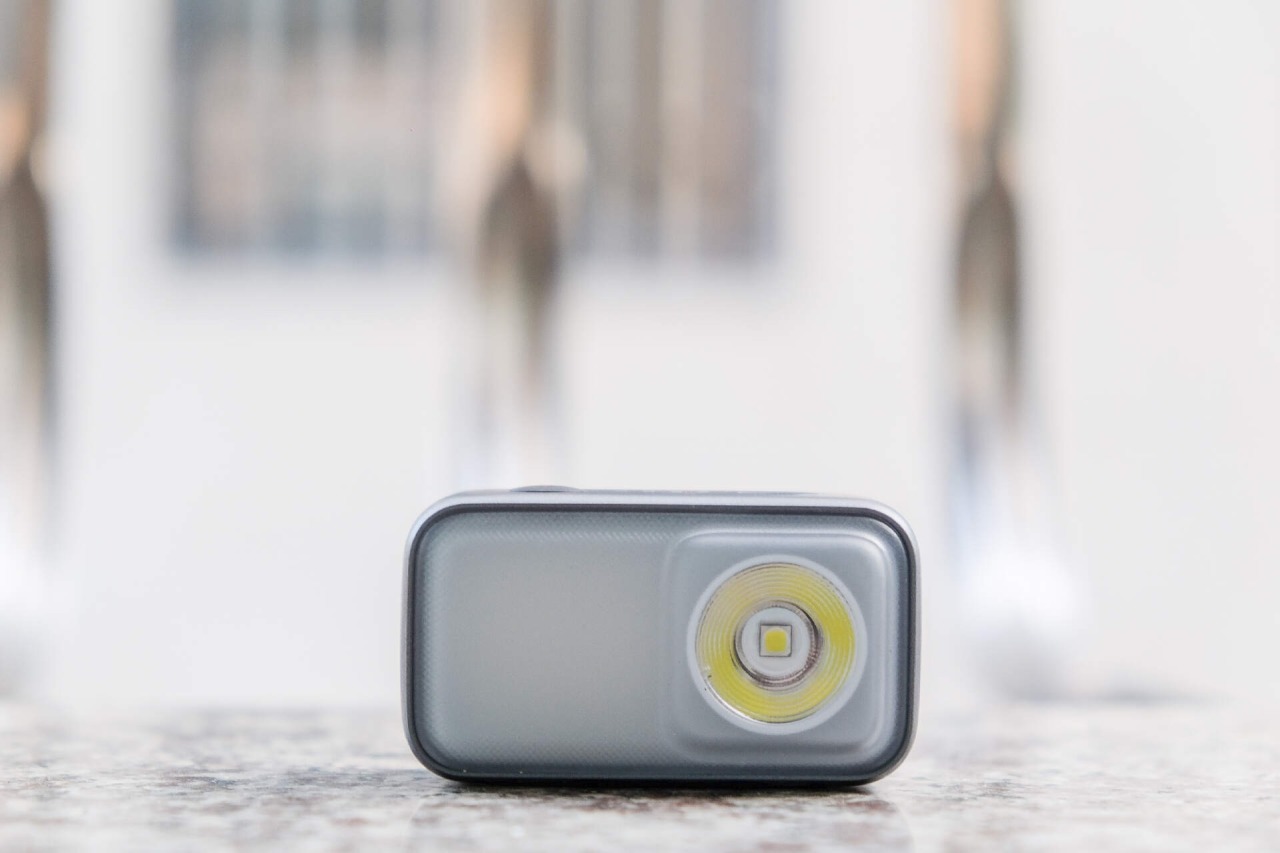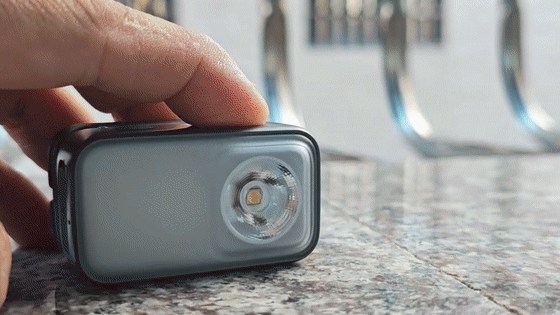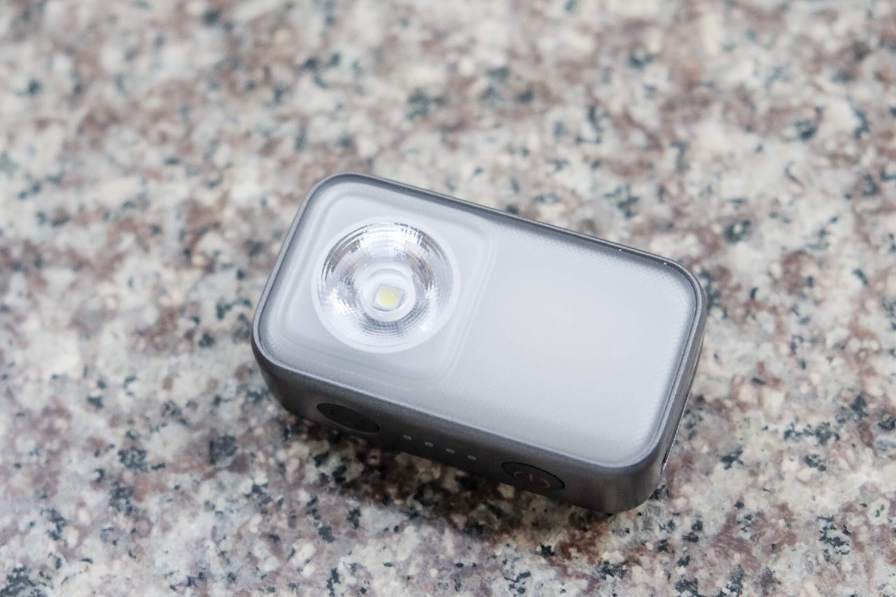 在顶部设有两枚实体按键。带红色电源标识的是开关机兼档位键,另一枚为模式键。关机时长按开关机键1.5秒即可开启;点亮后,短按此键则可在低、中、高三种亮度档位间循环切换。两枚按键中间设有四颗白色LED电量指示灯,每颗代表25%电量,开机时会亮起约5秒,方便用户快速掌握剩余电量。
