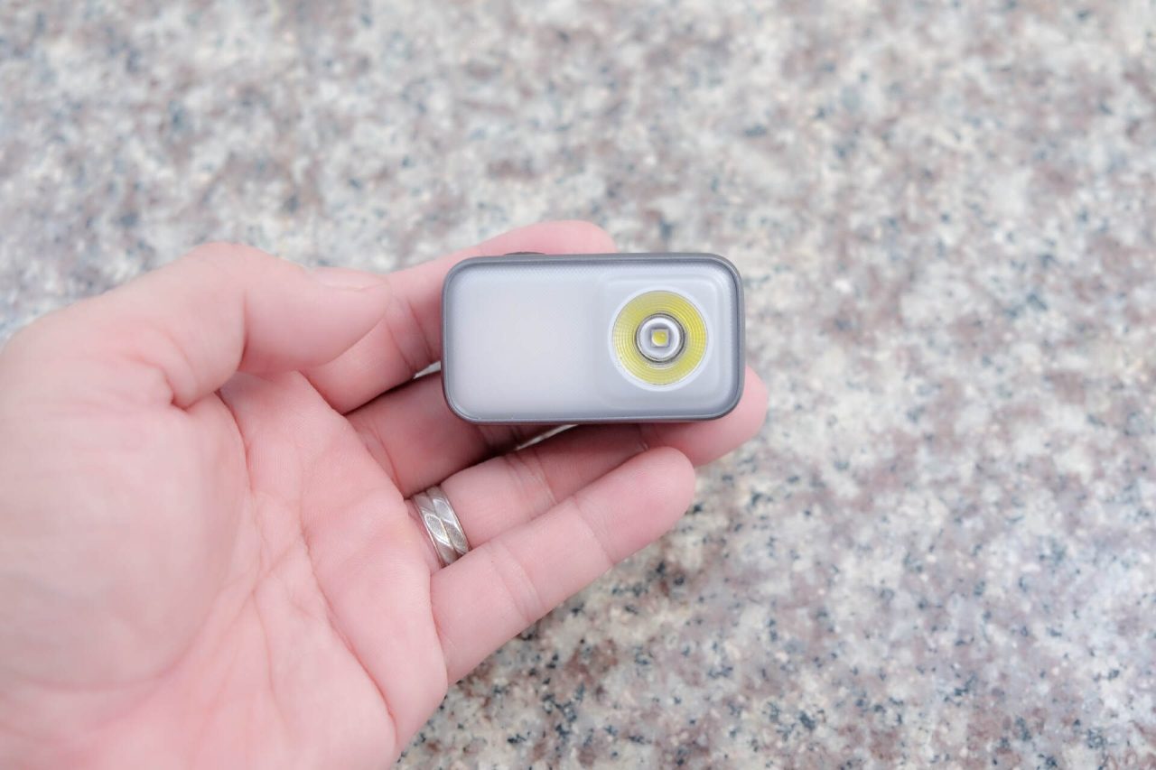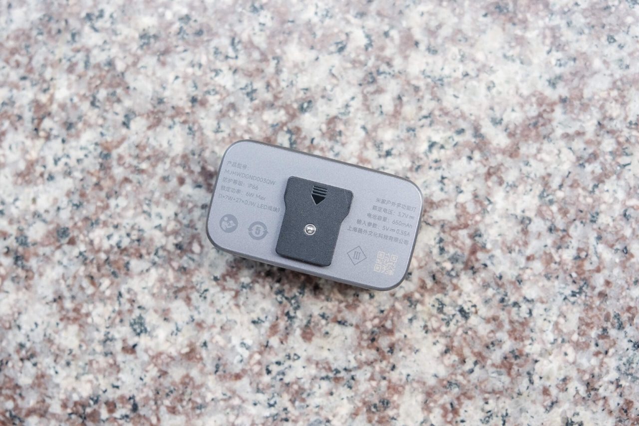 接着看看米家户外多功能灯,本体,给人的第一印象就是极致小巧。它的尺寸仅为57毫米长、32毫米宽、23.4毫米厚,重量更是控制在大约86克。拿在手上,这种轻盈感让人很难相信它集成了强大的照明功能,无疑为日常携带或户外徒步减轻了负担。