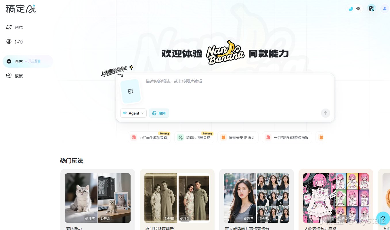 这里给大家分享一个国内可用的 Nano Banana 替代工具「稿定AI创意画布」。