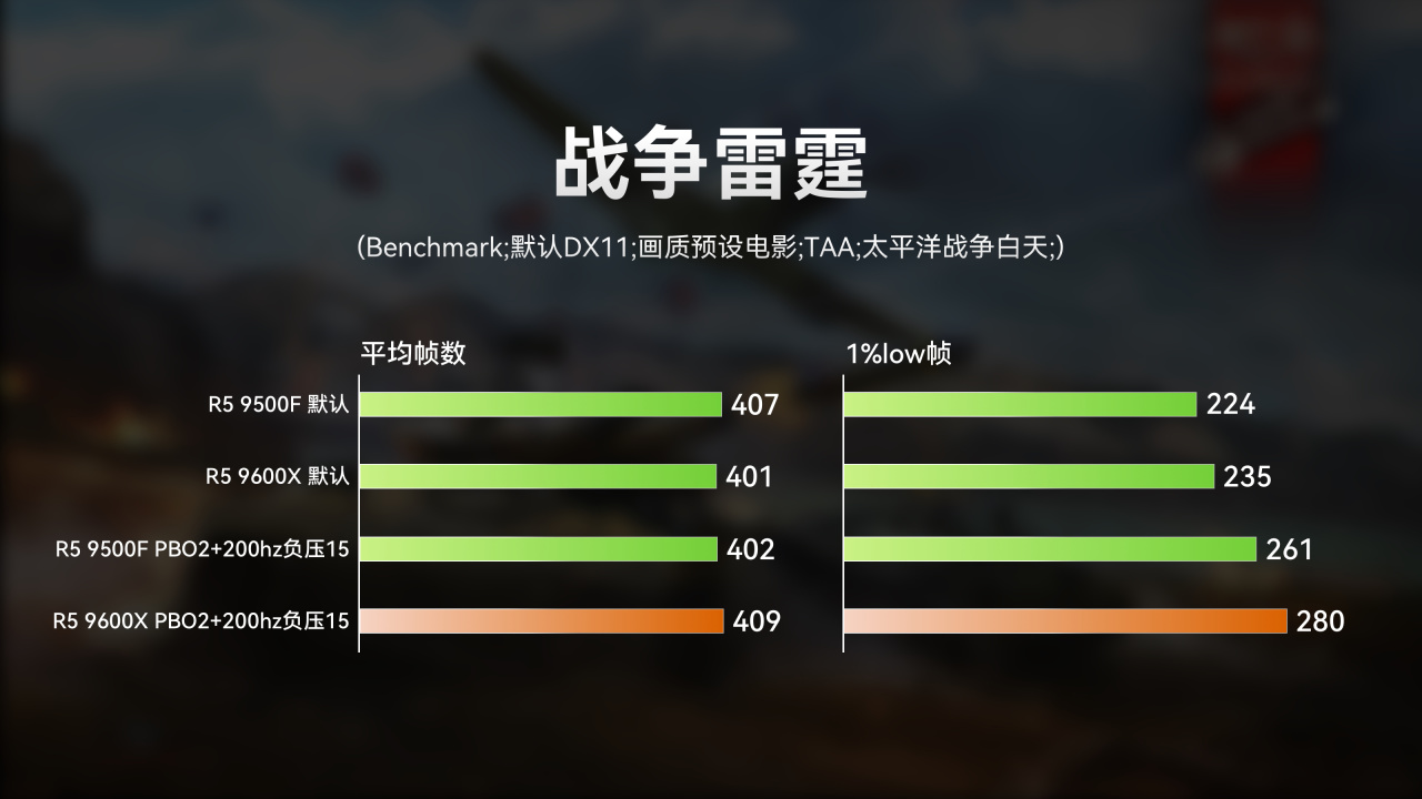 战争雷霆这个游戏我们测试下来,帧率对CPU的频率似乎不太敏感,都超过了400的平均帧且基本保持一致,但两款CPU都在开启PBO之后1%Low帧都上涨了40帧左右,同样9500F开启PBO打赢了默认9600X与开启PBO的9600X差距微乎其微。