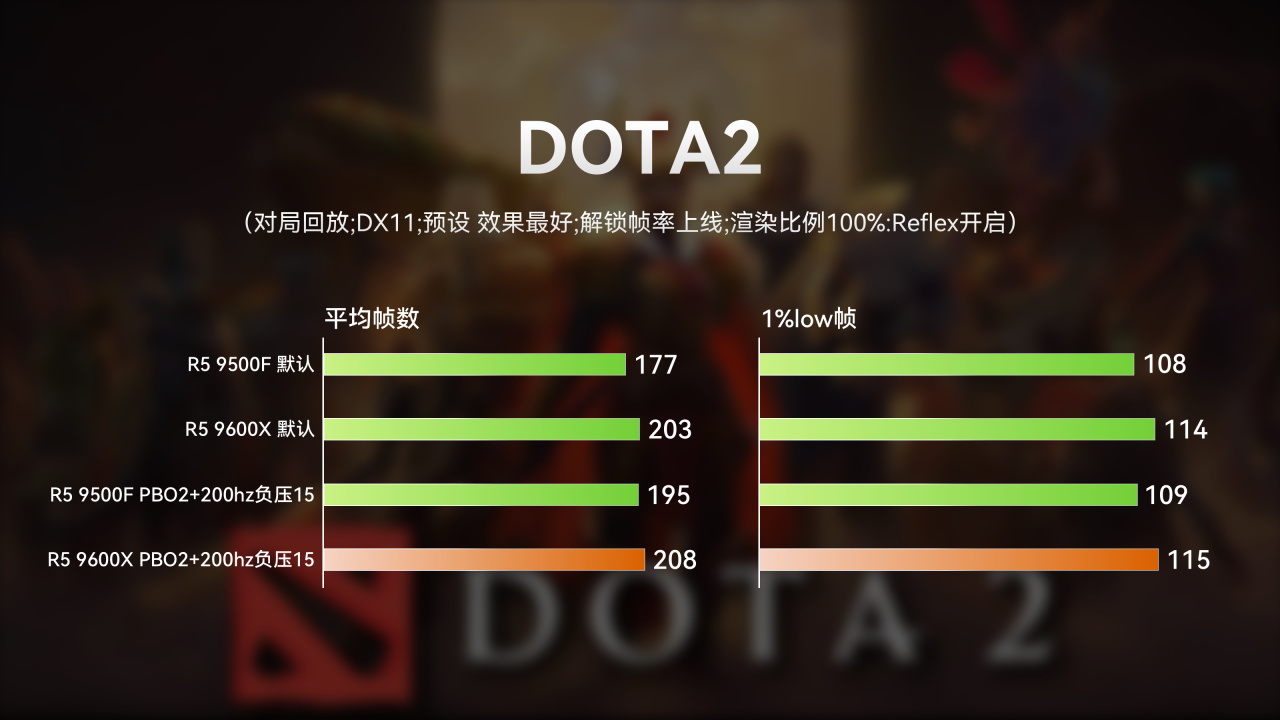 在DOTA2中,9500F默认落后9600X 26帧,开启PBO之后仅差7帧,基本可以忽略不计。两款CPU四种模式下的1%Low帧也都在110上下,在这个游戏里9600X小胜一筹。